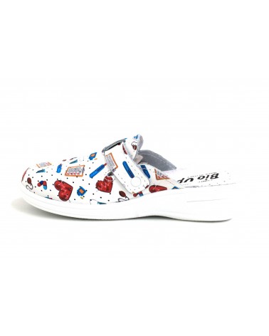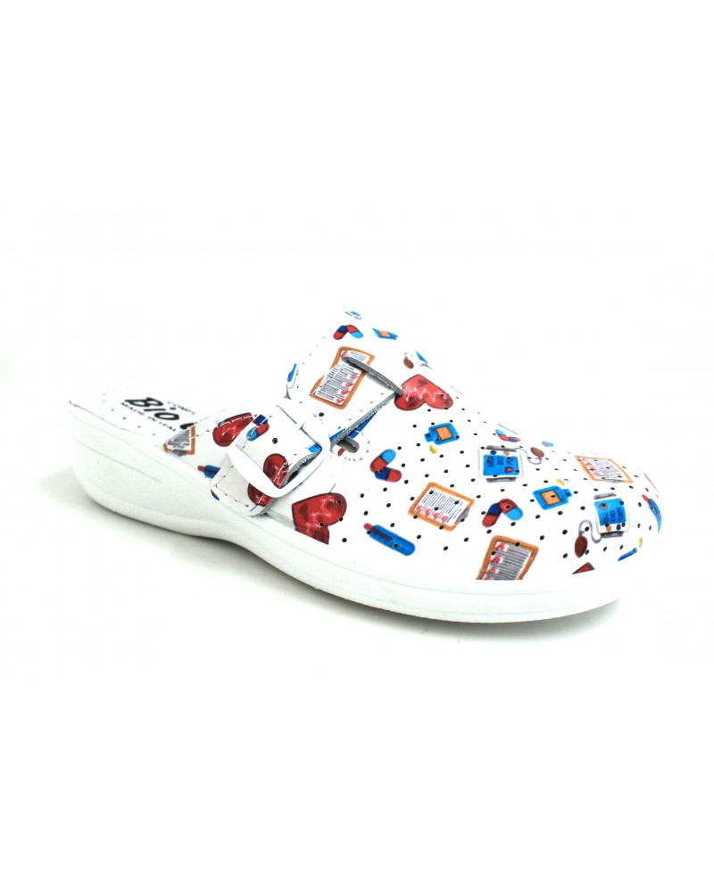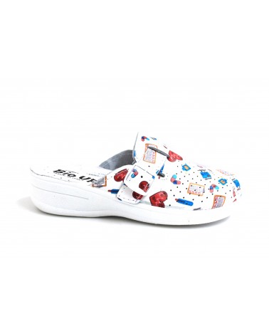 Zueco de señora en piel estampada picada, planta de piel y piso de goma antideslizante