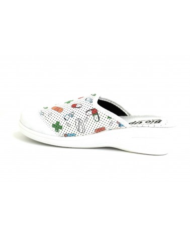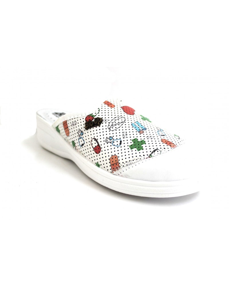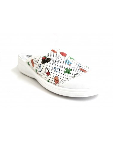 Zueco de señora en licra perforada estampada y puntera en piel. Planta de piel y piso de goma antideslizante