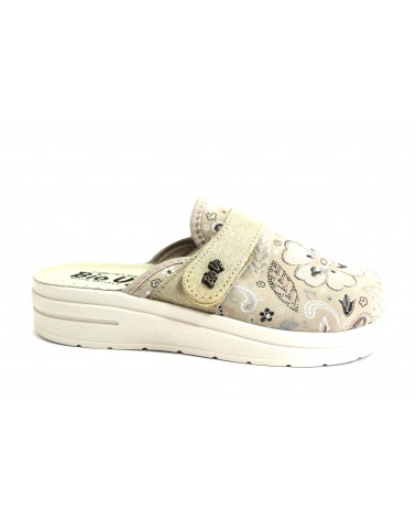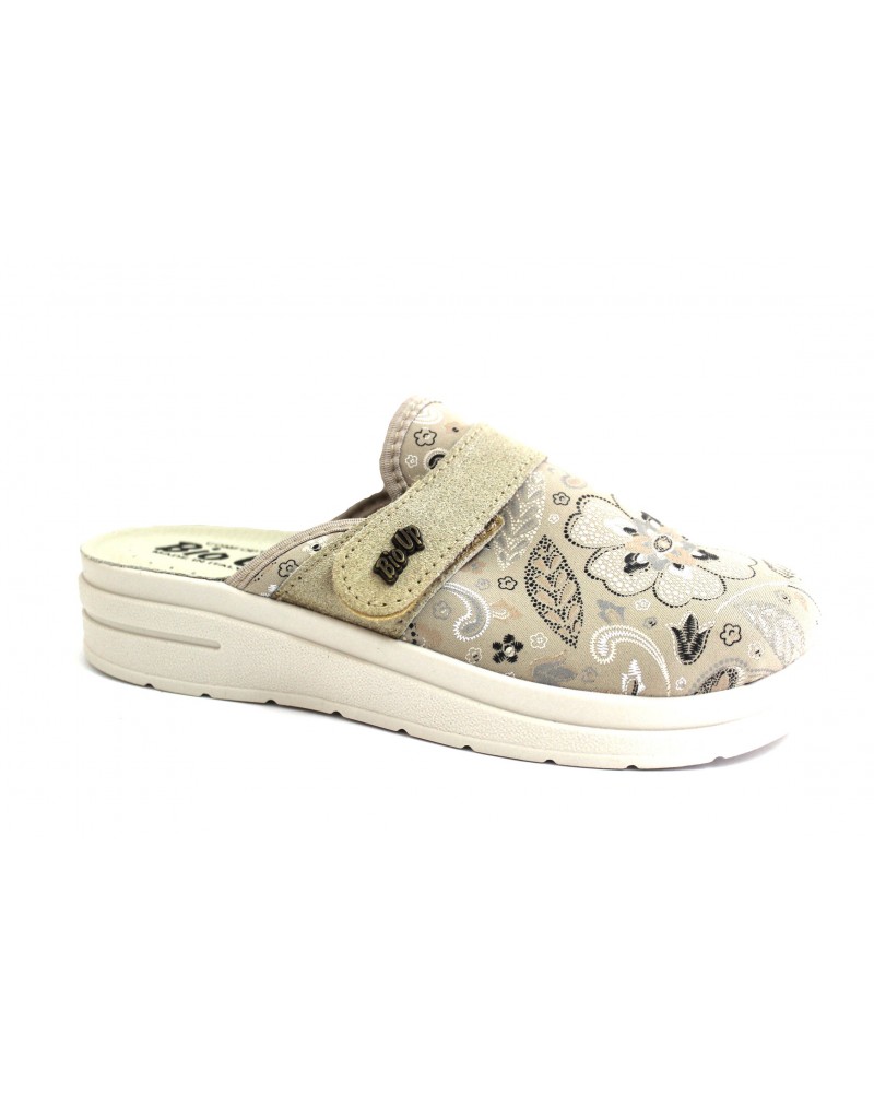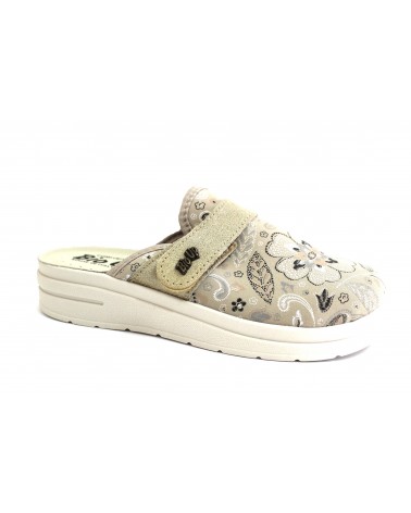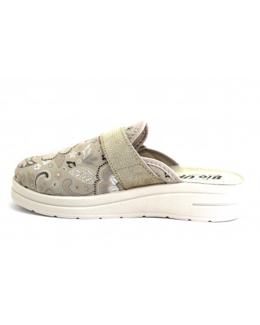 Zueco de señora en licra estampada y puntera en piel. Planta piel y piso de goma antideslizante