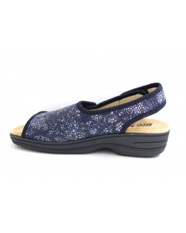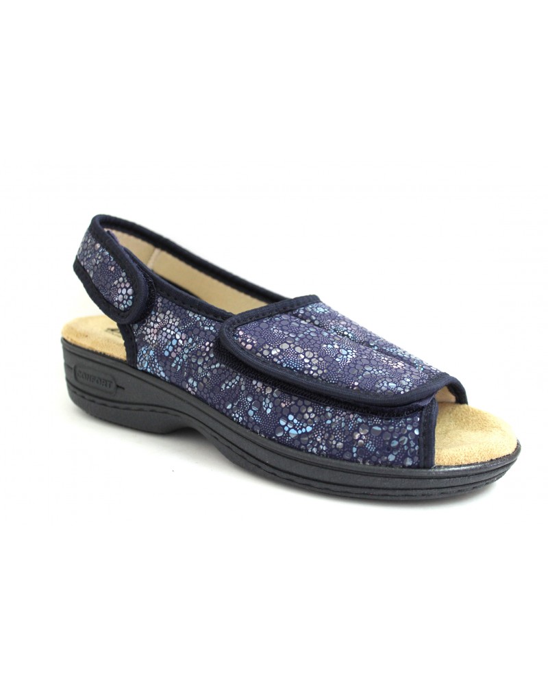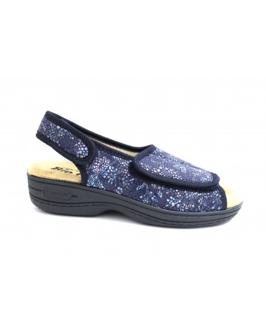 Sandalia de señora en licra estampada con correa trasera velcro, velcro en el empeine, planta tejido acolchada y piso de goma antideslizante